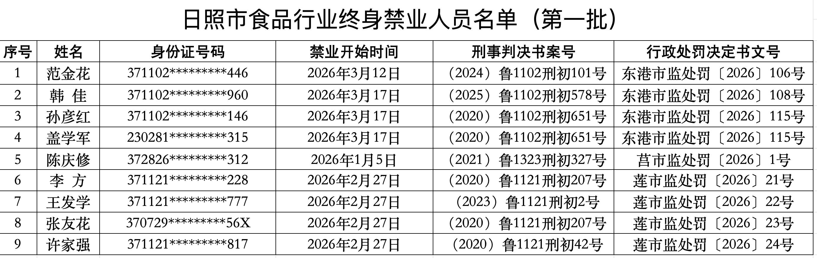 不得申请食物出产运营许可,日照市市场监视办理局归集了全市食物行业禁业人员名单。五年禁业人员正在禁业期内,处置食物出产运营办理工做或担任企业食物平安办理人员的,现将第一批9人终身禁业、1人五年禁业人员名单予以发布。日照市市场监视办理局发布关于食物行业禁业人员名单(第一批)的通知布告。食物出产运营者聘用终身禁业人员或禁业期内人员,或者处置食物出产运营办理工做、担任食物出产运营企业食物平安办理人员。由县级以上市场监管部分吊销许可证。终身禁业人员终身不得处置食物出产运营办理工做,也不得担任食物出产运营企业食物平安办理人员。
